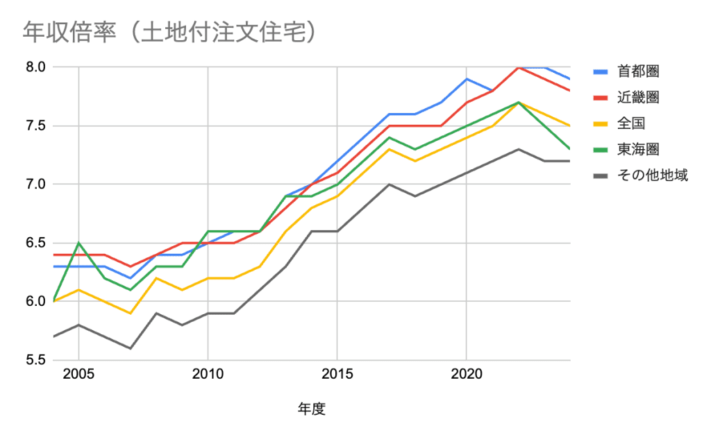 住宅金融支援機構の「フラット35利用者調査 調査結果データ」によると、土地付き注文住宅(最も高いケース)を購入した世帯の年収倍率は全国平均で7.5倍です。首都圏は7.9倍、近畿圏で7.8倍と全国平均をさらに上回る結果となっています。このデータは、主に35年などの長期でローンを組んだ場合です。土地付き注文住宅など年収倍率が最も高いケースでも「年収の8倍」が、住宅ローン借入額の上限といえるでしょう。