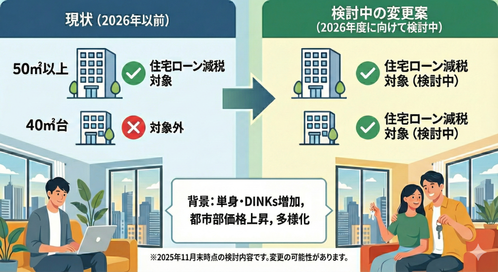 2026年度に向けて検討されている緩和案では、これまで対象外だった40㎡台の物件購入についても、住宅ローン減税が対象になる方向で調整が進められています。所得要件が設けられていた一時的な措置を、恒久化する方向で検討が進められているということです。