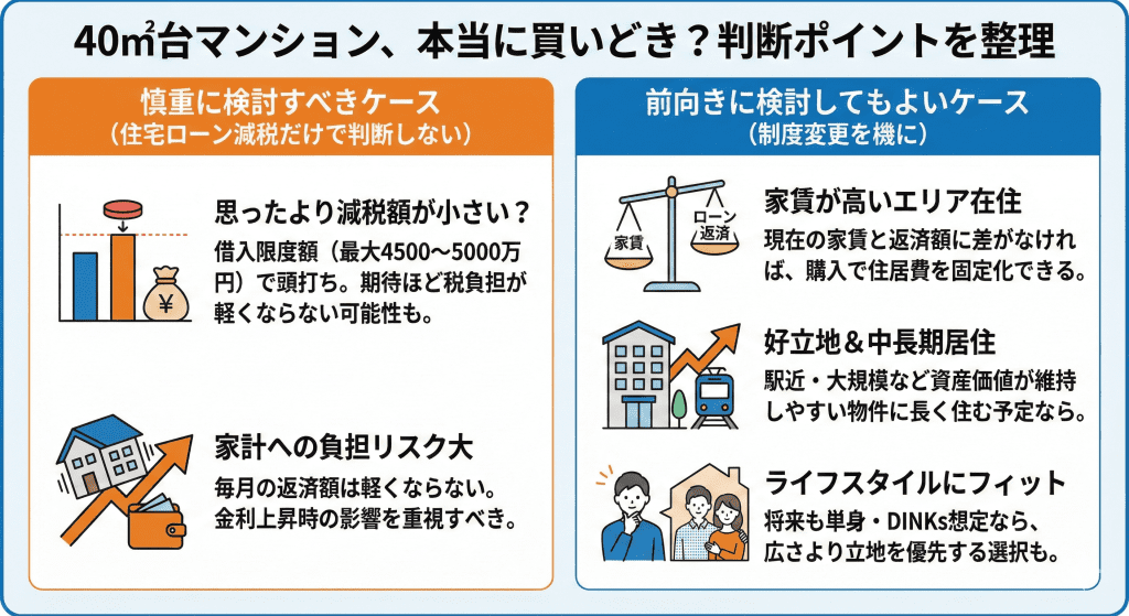 制度変更によって、40㎡台マンションの購入者の負担が軽くなるのは間違いありませんが、減税されるかどうかだけで購入を判断するのはおすすめしません。家計に無理のない返済計画になっているか、金利の選び方は適切か、物件の資産性はどうかといった視点を持ち、総合的に判断すべきでしょう。