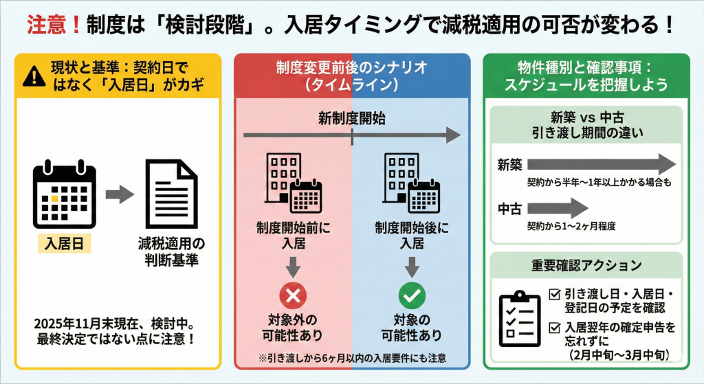 2025年11月末現在、40㎡台マンションが住宅ローン減税の対象に含まれる方向で検討が進められているものの、「最終決定」がなされたわけではありません。制度が適用されるのは入居日が基準となるため、物件の購入タイミングが減税の有無に直結します。